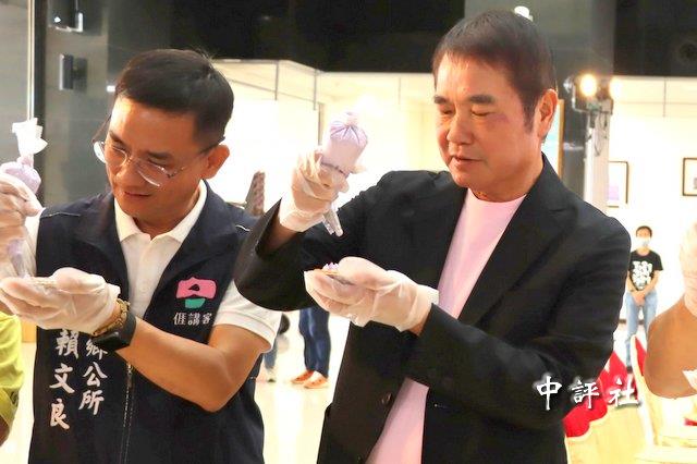 苗栗縣長鍾東錦動手DIY製作芋頭甜點。(中評社 盧誠輝攝)