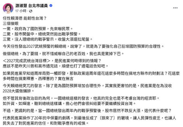 國民黨台北市議員游淑慧說,賴清德發出2027武統預警,是在為沒收2028大選做鋪排?(照片:游淑慧臉書)