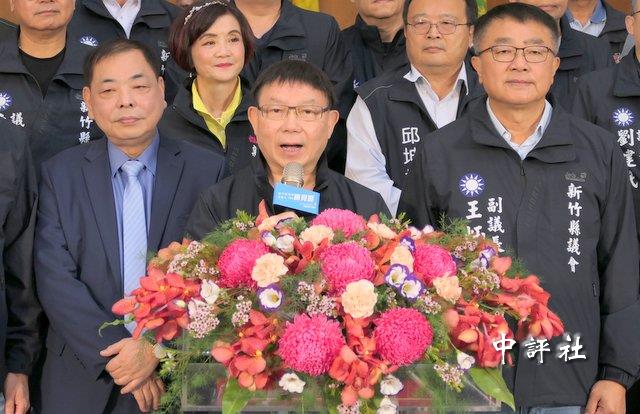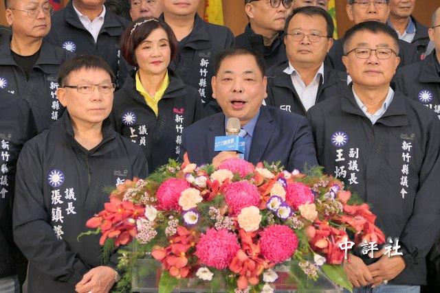 現場包括新竹縣正副議長與20多位新竹縣議員都到場支持。(中評社 盧誠輝攝)