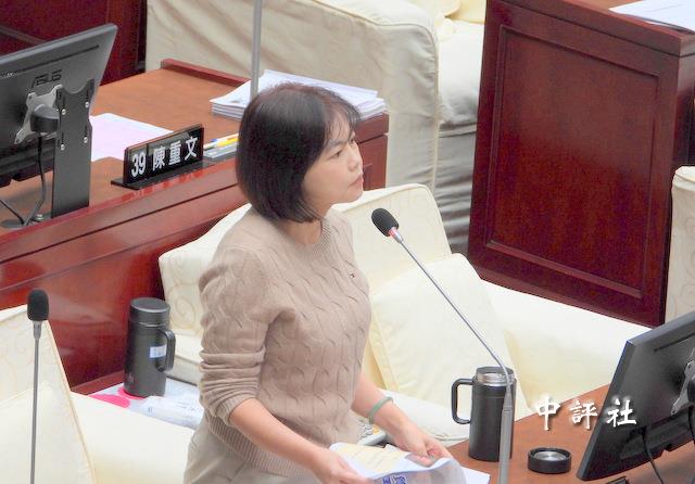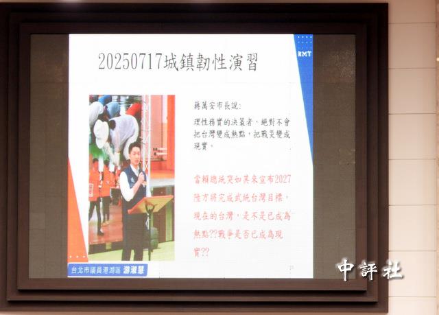 國民黨台北市議員游淑慧秀出台北市長蔣萬安曾在賴清德面前提醒戰爭危險的簡報。(中評社 張穎齊攝)