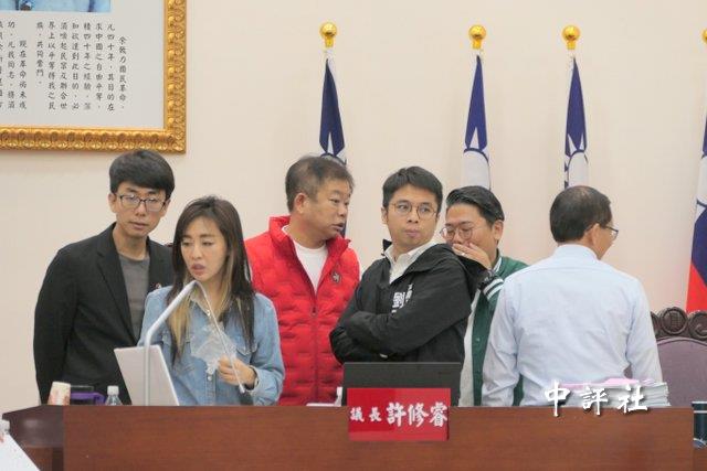 民眾黨籍新竹市議員李國璋和民進黨籍新竹市議員進行溝通。(中評社 盧誠輝攝)