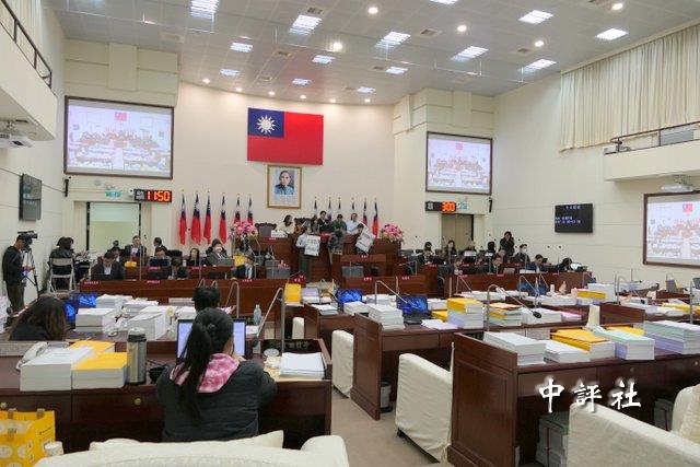 民進黨新竹市議會黨團2日霸占議場主席台癱瘓議事。(中評社 盧誠輝攝)