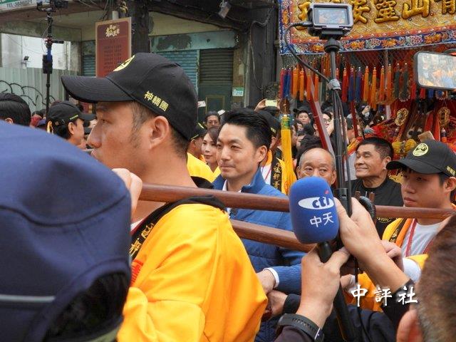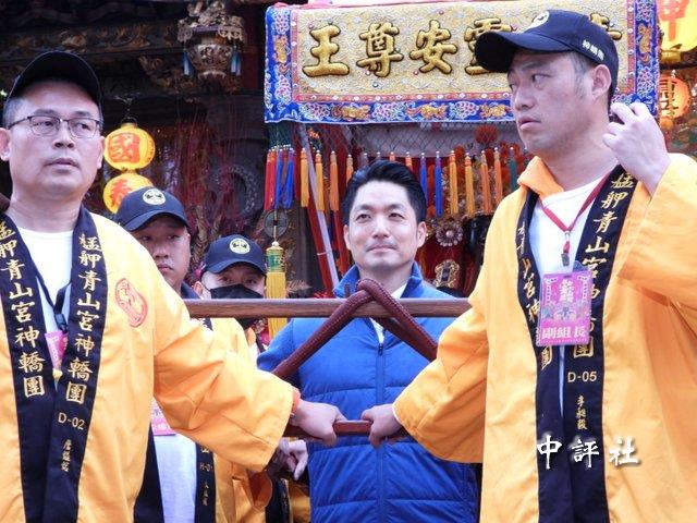 萬華艋舺青山宮一年一度的青山王祭登場,台北市長蔣萬安扶轎步出宮門。(中評社 莊亦軒攝)