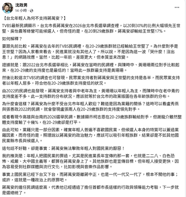 沈政男指出,《TVBS》最新民調顯示,蔣萬安在2026台北市長選舉調查,以20%到30%的比率大幅領先王世堅、吳怡農等綠營可能候選人,但奇怪的是,在20至29歲族群卻輸給王17%。實際上,蔣在去年《TVBS》民調,在該族群就已輸給王了。