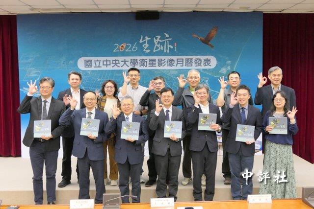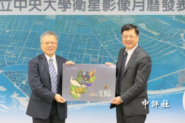 台灣中央大學蕭述三校長(左)和“內政部國家公園署”王成機署長(右)共同發表2026年衛星影像月曆。(中評社 盧誠輝攝)