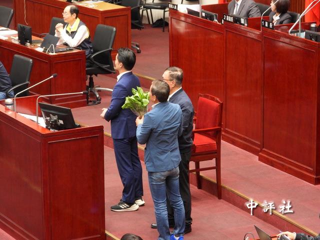 國民黨台北市議員鍾小平送植栽祝福台北市副市長李四川。(中評社 張穎齊攝)