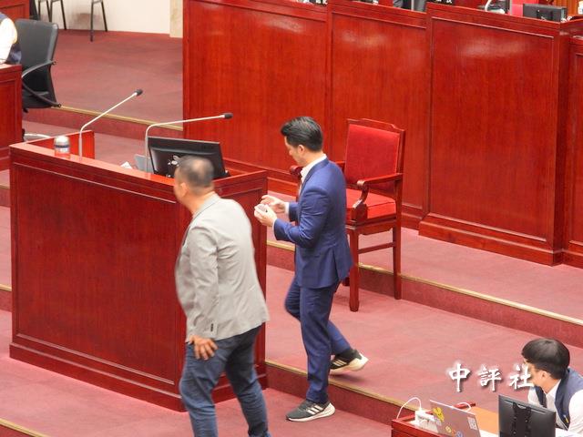 國民黨台北市議員陳重文送台北市長蔣萬安士林北投的純淨水瓶,順道祝福台北市副市長李四川。(中評社 張穎齊攝)