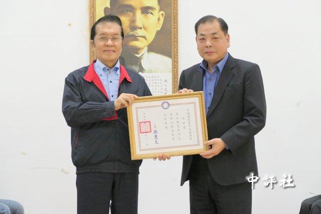 國民黨新竹縣黨部主委陳見賢頒發派任書給副主委。(中評社 盧誠輝攝)
