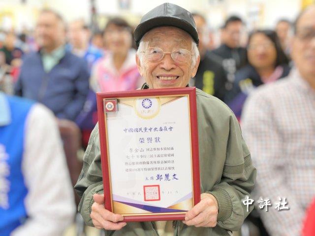 中評社新竹12月12日電(記者 盧誠輝)中國國民黨新竹縣黨部12日舉行國民黨131周年黨慶活動,在會中表揚一位已高齡94歲的老黨員李金山,他加入國民黨已超過70年的黨齡,從1949年隨青年軍到台灣後,就始終沒有離開過國民黨,因此獲得國門黨新竹縣黨部特別頒獎表揚。