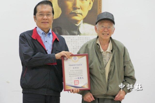 國民黨副主席張榮恭頒發榮譽狀給資深黨員李金山。(中評社 盧誠輝攝)