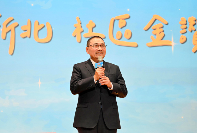 侯友宜12日在新北市社會局長李美珍等人的陪同下,出席2025年度金卓越社區選拔績優社區表揚暨成果展,並於會前短暫接受媒體聯訪。