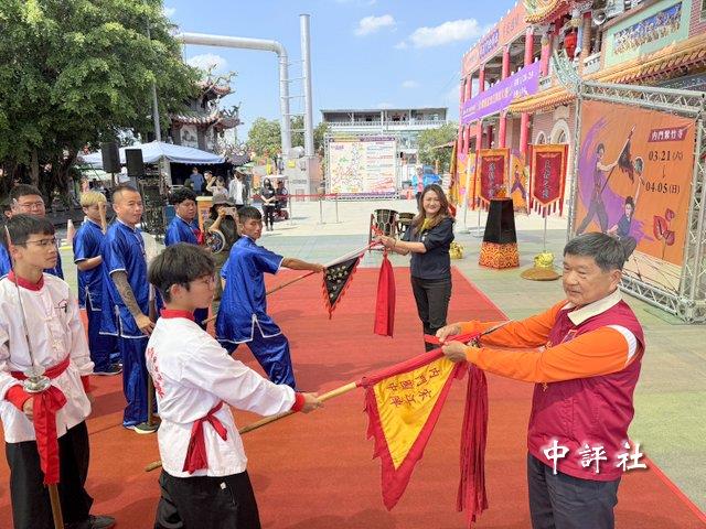 2026內門宋江陣總體行銷記者會17日上午在內門紫竹寺廟埕廣場舉辦,開場安排內門國中傳統宋江陣與內門子弟創意宋江陣演出,並進行頭旗結綵儀式。