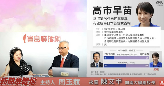 陳文甲說,就觀察上,黨員票多為高市早苗拿下,反映出地方非常支持她,不管是想當中央或地方代表,勢必要跟黨員呼應,“一定要很強的母雞才能帶動小雞”,民意和黨意不能忽視,因此高市理所應當勝出。