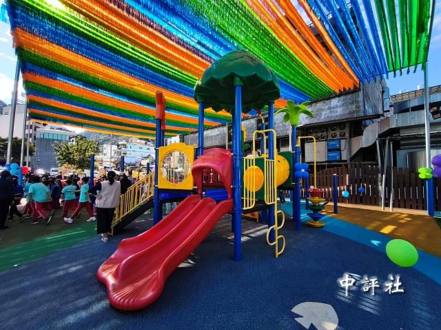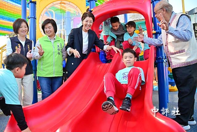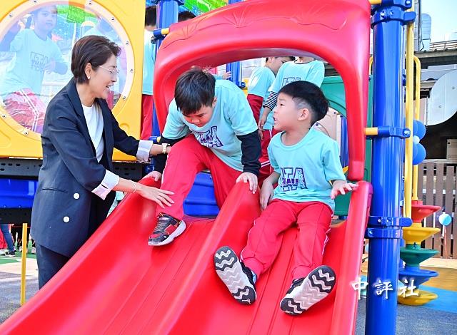 兒童體驗親子公園遊憩設施。(中評社 方敬為攝)