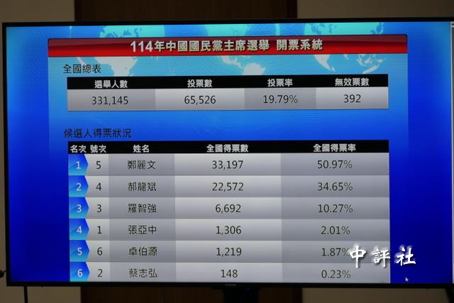 此次國民黨主席選舉,有投票權黨員約33萬人,由於投票踴躍,國民黨預估投票率有望破五成。目前的開票離島部分和海外黨員及一些縣市都已開票員完成,幾乎都是鄭麗文領先。