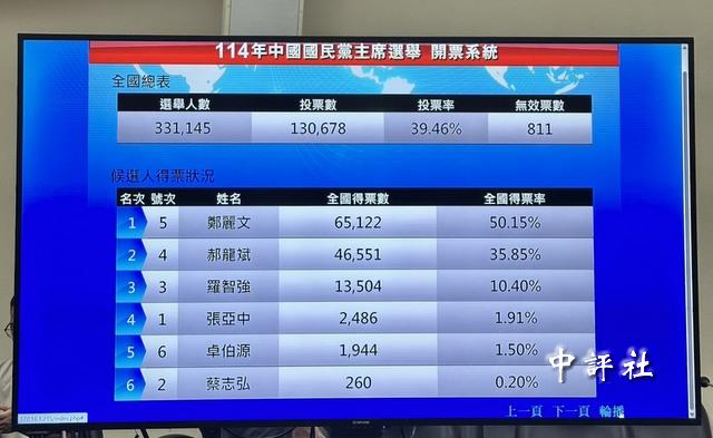 中評社台北10月18日電(記者 張嘉文)中國國民黨主席選舉在今晚7點多完成全部的開票作業,選監小組召集人、副主席連勝文出面宣布,由候選人鄭麗文以6萬5122票,50.15%的過半得票率當選國民黨主席。