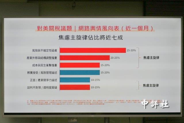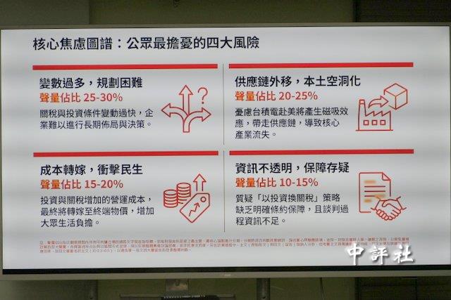 張顯耀說,這次對美關稅中,“賴政府”有嚴重的四個不足,包括談判的透明化不足、對外說明不足,至今還有很多隱晦不清的地方、對業界造成衝擊評估不足,政府政策方向不足,造成六成以上業界產生憂慮,產業成本風險增加進而空洞化和產業外移。