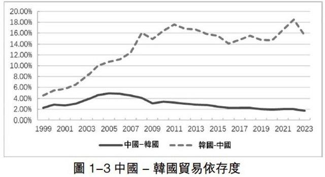 從中韓貿易依存度來看(圖1-3), 1999—2023年期間,中國與韓國貿易依存度也呈現“中國對韓國依存度下降,韓國對中國依存度上升”的變動格局。中國對韓國貿易依存度(“中國-韓國”)整體呈下行趨勢,而韓國對中國貿易依存度(“韓國-中國”)長期保持上升態勢,反映出兩國貿易依賴關係的轉變。1999—2005年,中國對韓國貿易依存度從約2.0%逐步升至4.0%以上,2005年後波動下降,2015年後穩定在2.0%以下。這一變化與中國產業升級、本土供應鏈完善及貿易多元化策略相關。韓國對中國的貿易依存度呈現顯著上升趨勢:1999年起步於4.0%左右,2005年後加速增長,雖期間存在短期波動但2021年整體攀升至近18.0%的高位。這表明韓國經濟對中國市場的需求持續加深,中國龐大的消費需求、產業鏈配套能力對韓國出口形成關鍵支撐作用。從進出口依存度對比看,2005年後韓國對中國的依存度持續顯著高於中國對韓國的依存度。