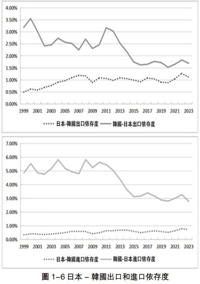 1999—2023年,日本與韓國貿易依存度呈現“韓國對日本依存度波動下降,日本對韓國依存度緩慢上升”的演變格局。韓國對日本貿易依存度整體呈波動下行趨勢,而日本對韓國貿易依存度雖增速平緩,但長期保持上升態勢,反映兩國貿易依賴關係的非對稱性調整。1999—2013年,韓國對日本貿易依存度在7.0%—9.0%區間波動,期間受產業合作、技術引進等因素影響,呈現階段性峰值(如2001年、2005年、2011年)。2013年後,依存度持續下降,2023年降至4.0%左右。從進出口依存度對比看,韓國對日本的依存度始終高於日本對韓國的依存度,但差距隨時間推移逐漸縮小。這一演變既反映韓國早期對日本技術、產業配套的依賴,也凸顯韓國產業競爭力的提升;同時,日本對韓國新興產業產品的需求增長,推動其對韓依存度緩慢上升。日本對韓國進口依存度長期處於低位(1.0%以下),1999—2023年呈緩慢上升態勢,反映韓國在日本進口供應鏈中的作用逐步提升。韓國對日本進口依存度呈現“波動下降”特徵,1999年約5.5%,2023年降至3.0%左右。