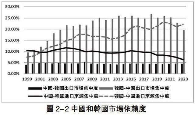 中國對韓國出口市場集中度長期處於低位(10%以下),波動幅度小,表明中國對韓國出口的市場集中程度低,出口市場多元化特徵顯著。與之對比,韓國對中國出口市場集中度呈持續上升趨勢,1999—2023年從不足15%升至超20%。中國對韓國進口來源集中度整體下降,從1999年約10%降至2023年6%左右。韓國對中國進口來源集中度呈波動上升趨勢,2005年後突破15%,2023年維持在20%以上,表明韓國對中國進口產品(如製造業中間品、成品)的需求持續加深。