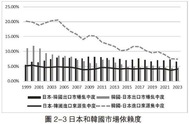 總體來看,日韓市場依賴度呈現“韓國對日本進口依賴度顯著下降,雙方出口市場集中度均趨穩或減弱”的特徵。