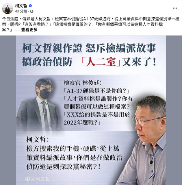 柯文哲7日在臉書發文表示,檢察官林俊廷從A1-37硬碟追問,從上萬筆資料中刻意揀選個別單一檔案,問“有沒有看過?”“這個檔案是誰做的?”“你有哪個幕僚可以做這種人才資料檔案?”檢察官更不斷刺探:某筆捐款是不是給XXX、XXX使用?