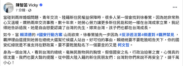 陳智菡強調,身為一個台灣人,看到台灣的“總統”,毫無民胞物與的胸懷,假借“國安”之名,行政治迫害之實,心情真的很沈重,我們也要大聲的提醒,從中國大陸入籍的新住民朋友們:台灣對你們來說不再安全了,請千萬小心!