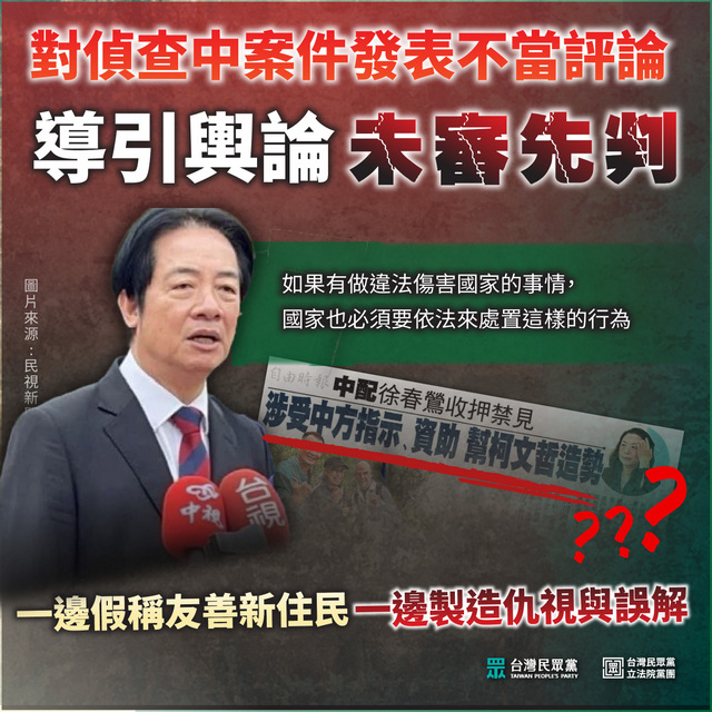 民眾黨指出,賴清德在提到徐春鶯案時,更直接表示“如果有做違法、傷害‘國家′的事情,‘國家′必須要依法來處置這樣的行為”,此發言更是毫無法治觀念可言,賴清德不僅帶頭踐踏 無罪推定原則,更公然下指導棋,而黨檢與部分媒體更是大力助攻,把調查中案件打成“罪證確鑿”、未審先判,目的就在刻意製造《反滲透法》與柯文哲之間的不當連結,司法成為為政治服務、追殺迫害的工具,昭然若揭。