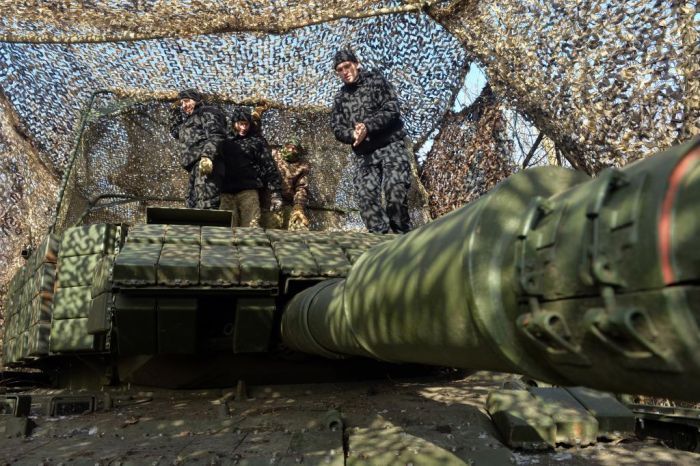 2月9日,烏軍第5獨立重型機械化旅第1坦克營士兵在檢查坦克。新華社