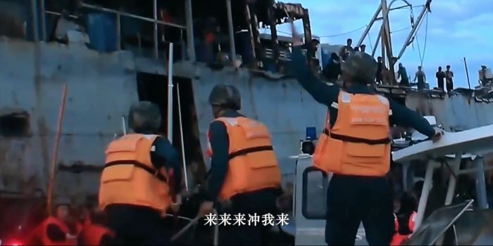 除了首度公開中國海警巡航釣魚島的畫面之外,記者注意到,在這部宣傳片中,還公開了多段中國海警在南海開展維權執法行動的畫面。其中以較大“篇幅”展現了2024年6月17日,中國海警處置菲軍方人員侵闖仁愛礁的事件。據瞭解,在這場維權執法行動中,面對潑灑不明液體、持槍的菲軍方侵權人員,中國海警執法員毫無畏懼,抱著“狹路相逢勇者勝”的必勝信念,與菲軍方侵權人員展開針鋒相對的鬥爭,現場繳獲對方槍支彈藥,用時僅6分鐘,成功將外方侵權船只拖離現場。