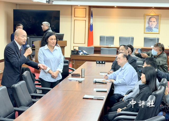 韓國瑜到協商現場致意,本想展現幽默化解緊繃,但被綠委助理嗆聲。(中評社 張嘉文攝)