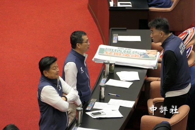 國民黨團總召傅崐萁、書記長羅智強及和首席副書記長林沛祥在議場內討論。(中評社 張嘉文攝)