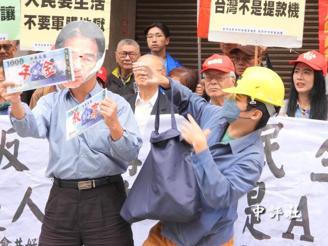 抗議團體上演行動劇,表達賴政府強行收走台灣勞苦大眾的血汗錢上貢給山姆大叔。(中評社 莊亦軒攝)