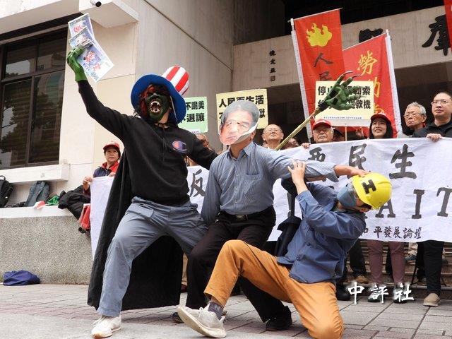 統派團體在“立法院”前抗爭並上演行動劇。(中評社 莊亦軒攝)
