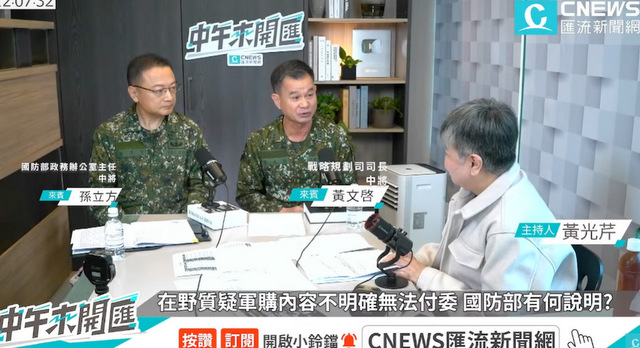 台“國防部”政務辦公室主任、中將孫立方(左)與戰略規劃司長、中將黃文啟(中)接受黃光芹(右)專訪。(照片:《中午來開匯》YouTube)