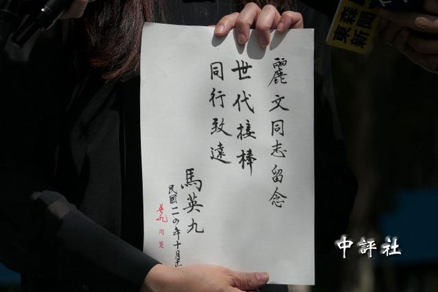 馬英九寫下,“麗文同志留念,世代接棒、同行致遠”等字鼓勵。(中評社 張嘉文攝)