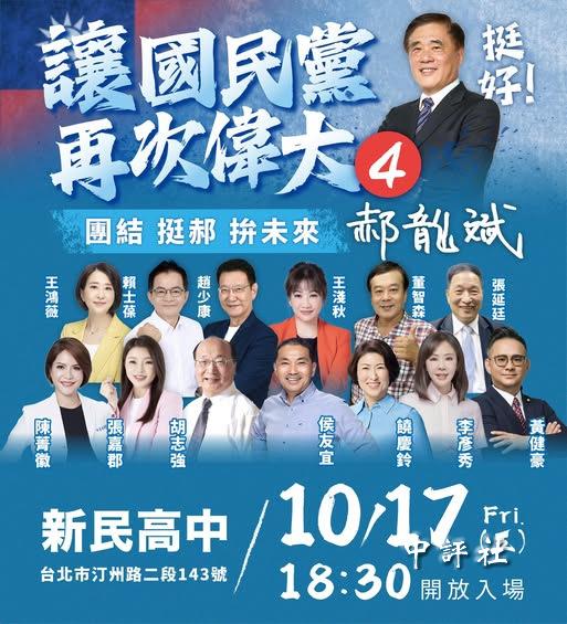 中評社台北10月17日電(記者 張嘉文)中國國民黨主席選舉將在18日進行投票,候選人郝龍斌17日晚上7點在台北市新民高中大禮堂舉辦選前之夜。同黨籍的新北市長侯友宜、台東縣長饒慶鈴將現身相挺。此外,前台中市長胡志強與台中市長盧秀燕子弟兵、藍委黃健豪將出席,是否代表盧秀燕的支持意向,值得觀察。