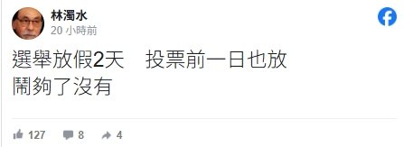 而針對民進黨推動“選舉放2天假”,林濁水3日在臉書發文砲轟,選舉放假2天,投票前一日也放,鬧夠了沒有?