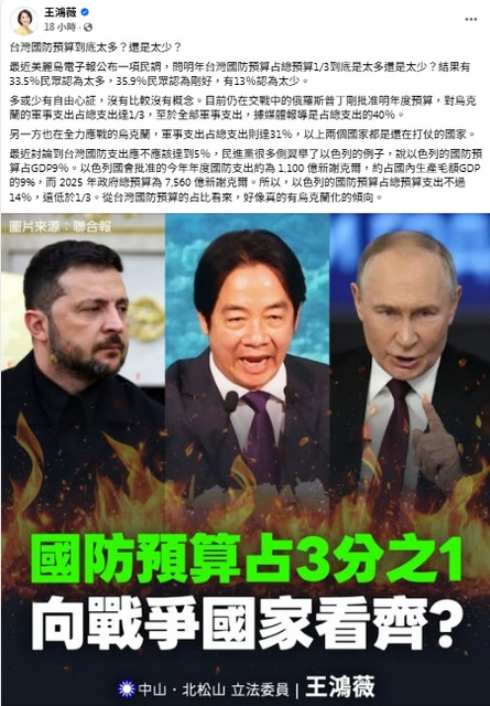 王鴻薇指出,目前仍在交戰中的俄羅斯“總統”普丁剛批准明年度預算,對烏克蘭的軍事支出占總支出達1/3。至於全部軍事支出,據媒體報導是占總支出的40%。另一方也在全力應戰的烏克蘭,軍事支出占總支出則達31%,以上兩個國家都是還在打仗的國家。