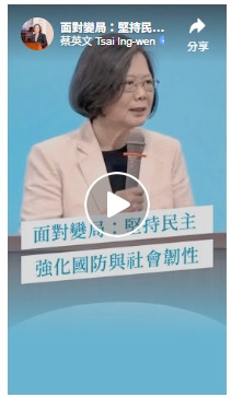 蔡英文也在臉書貼出當日參與台灣勵志協會活動的致詞影片,她說,台灣是一個在困難環境中,仍然堅持民主自由、維持開放社會的國家。尤其面對來自中國的威脅,如何在民主自由社會中,凝聚重要的共識,強化“國防”與社會韌性,是大家必須面對的課題。