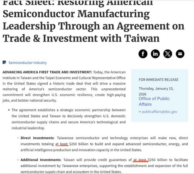 美國商務部表示,台灣將提供至少2500億美元的信用保證。(照片:美國商業部官網)