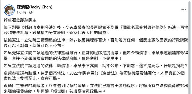卓榮泰不副署眷改條例 民眾黨團轟帝制